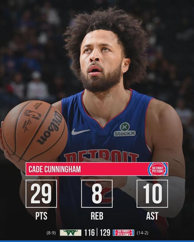 三节打完,活塞104-85领先19分。第四节其实没有多大悬念了,活塞主力又上去打了一会,正式带走比赛。全场结束,活塞129-116击败雄鹿。活塞豪取12连胜,14胜2负稳居东部第一。活塞领先第二的猛龙3个胜场,优势比较明显。